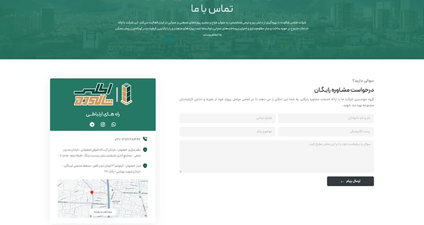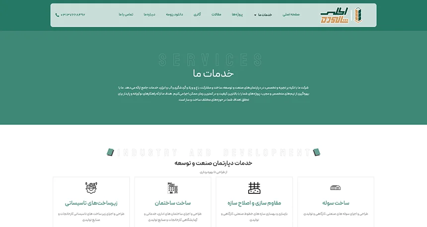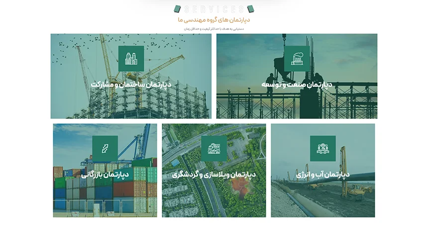 - تمامی فعالیتها و پروژههای اجرایی شرکت بهصورت دقیق دستهبندی و معرفی شدهاند، همراه با استفاده از المانهای بصری ساده و جذاب که به کاربر در مرور اطلاعات کمک میکند، بدون آنکه حس شلوغی در سایت ایجاد شود.